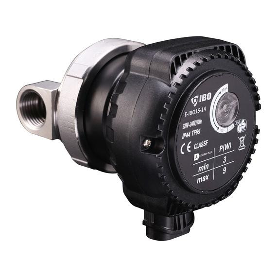 Az E-IBO 15-14 szivattyú egy fokozatmentesen szabályozható, elektronikus melegvíz keringető szivattyú, amely automatikus vagy manuális paraméterbeállítást tesz lehetővé a rendszer igényeihez igazodva. A szivattyú lelke egy gömbrotor, amely magas kopásállóságú kerámia tengelyen forog, és különböző szögállásokban is megbízható működést biztosít. A rotor háza ellenálló PPO polimerből készül, így hosszú élettartamot és megbízhatóságot kínál. A szivattyú névleges emelőmagassága 1,2 méter, maximális térfogatárama 12 liter/perc, motor teljesítménye pedig mindössze 9 watt. A működési hőmérséklet-tartománya +2 °C-tól egészen +95 °C-ig terjed, IP44-es védettséggel és F osztályú szigeteléssel rendelkezik. A szivattyú ½”-os csatlakozásokkal, villásdugóval ellátott kábellel és rendkívül halk, mindössze 43 dB zajszinttel kerül forgalomba.