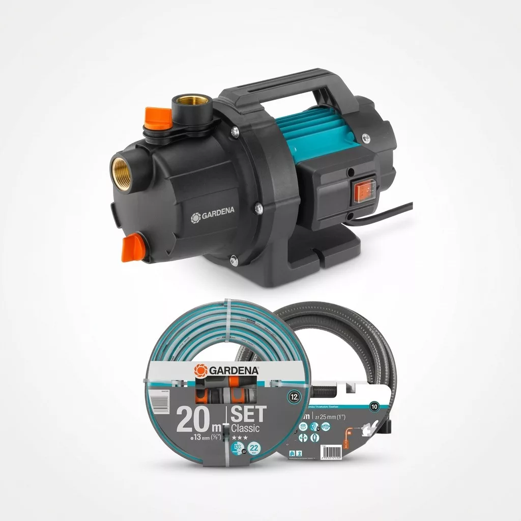 A csomag tartalmazza a klasszikus Kerti szivattyú 3000/4 BASIC szivattyút, egy 3,5 méter hosszú GARDENA szívóegységet és egy eredeti GARDENA 20 méter hosszú kerti tömlőkészletet, a szórófejjel és a csatlakozóelemekkel.