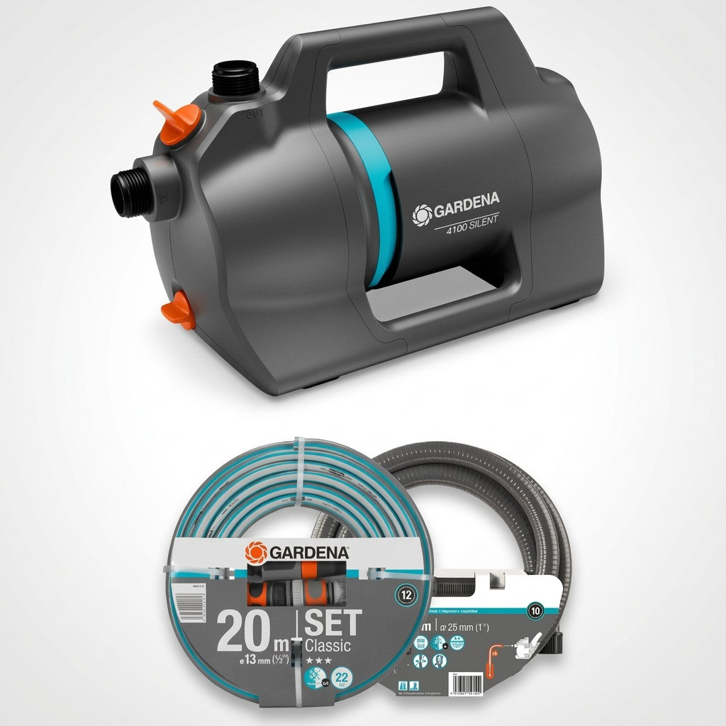 A Gardena Kerti szivattyú 4100 Silent készlet 550 W teljesítménnyel rendelkezik, és akár 4100 liter vizet is képes szállítani óránként. A maximális nyomás 3,6 bar, míg a maximális tápmagasság eléri a 36 métert. A szivattyú önfelszívó képessége 8 méter, és a maximális folyadék hőmérséklete 35 °C lehet. A készülék 1,5 méteres H07 RNF típusú tápkábellel van ellátva, és IP X4 elektromos védelmi osztállyal rendelkezik, amely biztosítja a biztonságos használatot.