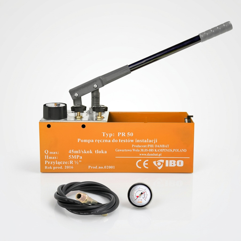 Az IBO PR-50 egy dugattyús kézi nyomáspróba szivattyú, amelyet csőhálózatok, tartályok és különböző nyomás alatti rendszerek tömítettségének ellenőrzésére fejlesztettek ki. A készülék működése egyszerű és hatékony: a nyomótömlőt a vizsgált rendszerhez kell csatlakoztatni, majd a tartályt tiszta – lehetőleg szűrt – vízzel kell feltölteni. A rendszer feltöltése után a kar segítségével a szükséges végső nyomás könnyedén beállítható, miközben a beépített nyomásmérő pontos visszajelzést ad a nyomásértékről.