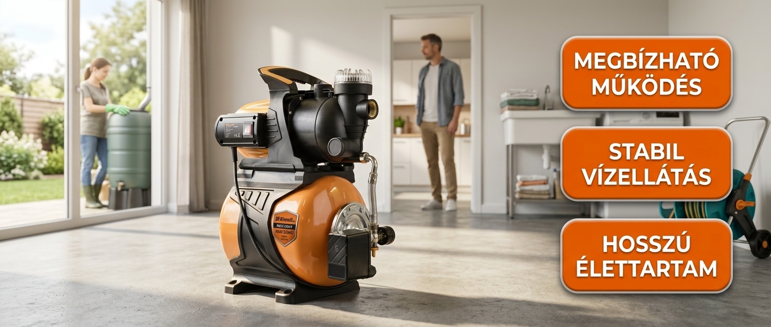 Fedezze fel a Riwall REHS 1224 F házi vízmű előnyeit, amely tökéletes megoldást nyújt otthona vagy kertje ivó- és használati vízellátására. Ez a kiváló minőségű vízmű könnyedén csatlakoztatható csaptelepre, mosógépre, vagy akár WC öblítésre is, és ideális a vízvezeték rendszer kisegítésére, öntözésre, valamint esővíz felhasználására tartályból. Az önfelszívós szivattyú korrózióálló anyagokból készült, és egy nagy, 2 literes integrált előszűrővel van ellátva, amely megakadályozza a szennyeződések bejutását a rendszerbe. Az erős, 1200 W-os motor hosszabb ideig is működhet a túlmelegedés veszélye nélkül, míg a 24 literes nyomástartó edény belső gumibélése biztosítja a tökéletes tömítést. A tartály nyomásmérővel és automatakapcsolóval van felszerelve, így a szivattyú csak a nyomás esésekor kapcsol be, biztosítva a hatékony és gazdaságos működést. A széles acéllábak stabilitást, a felső markolat pedig könnyű mozgatást biztosít.