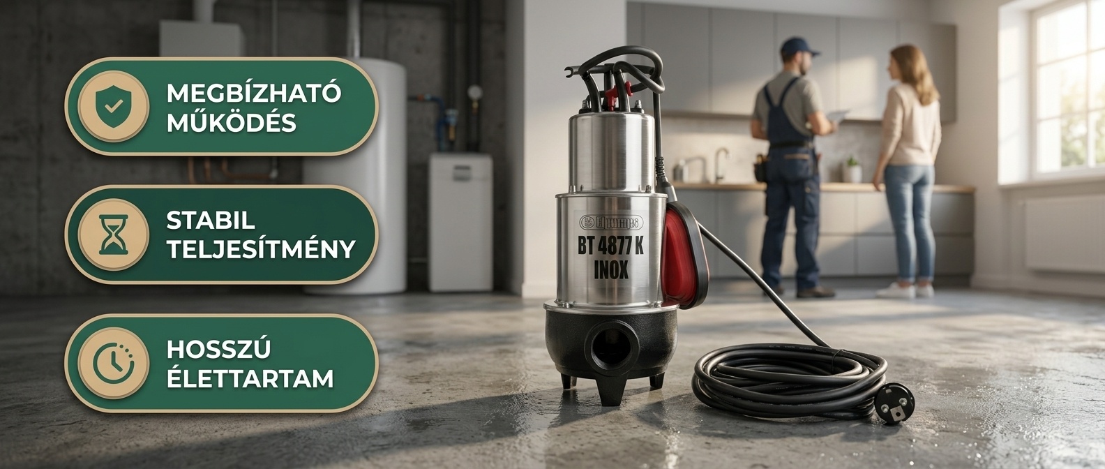Az Elpumps BT 4877 K INOX szennyvízszivattyú egy erős, 900W-os motorral van felszerelve, amely akár 28,000 liter folyadékot képes továbbítani óránként. A szivattyú INOX rozsdamentes acélból készült háza és tengelye ellenáll az agresszív szennyvizeknek is, így hosszú élettartamot és megbízható működést garantál. Az öntöttvas hidraulikatér és lapátkerék biztosítja a szivattyú kiváló teljesítményét még nehéz körülmények között is. A szivattyú tengelyének tömítése modern, kerámia-szilícium betétes axiáltömítéssel rendelkezik, amely hozzájárul a rendszer kiemelkedő tartósságához. Az integrált úszókapcsoló automatikus ki- és bekapcsolást tesz lehetővé, míg a túlmelegedés elleni védelem és az áramvédő relé a biztonságos működést biztosítja, megelőzve a motor súlyos károsodását. Ez a szennyvíz szivattyú a víz szintje alá maximum 5 méterig biztonsággal telepíthető, ami a szinte minden esetben elegendő.
