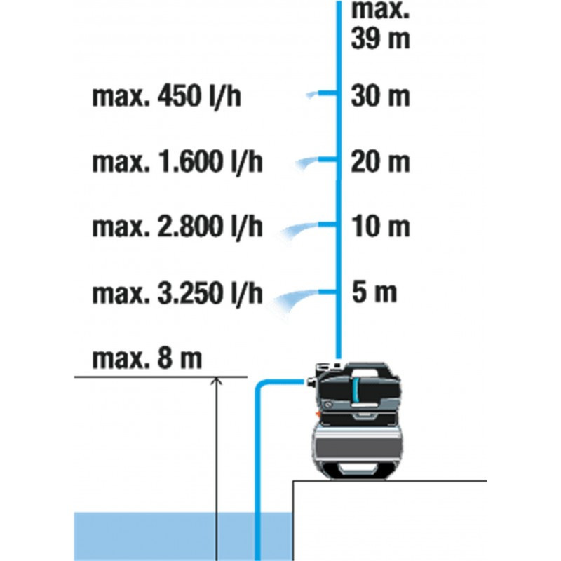A szivattyú teljesítménye 600 W, maximális szállítási magassága 39 méter (3,9 bar), míg maximális vízszállítása 3800 l/óra. A készülék legfeljebb 8 méteres szívómélységből képes vizet emelni, a szállított folyadék maximális hőmérséklete 35 °C lehet. A rendszer 21 literes tartállyal rendelkezik, amely stabil nyomást és ritkább kapcsolási ciklust biztosít. A csatlakozók mérete szívó oldalon 1" x 1/2", nyomó oldalon 1" x 1/2", így könnyen integrálható meglévő rendszerekbe is.
