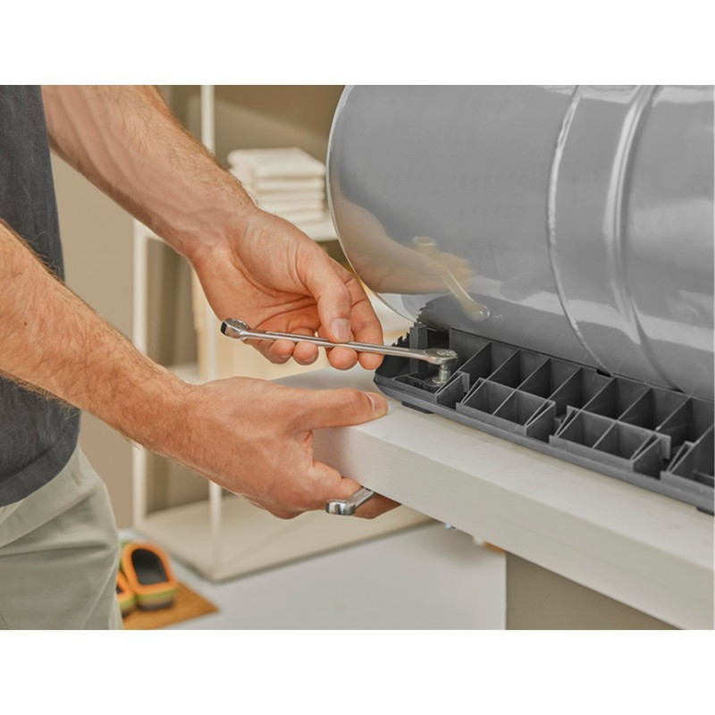A tápellátás 1~230 V, 50 Hz hálózatról történik, a 1,5 méter hosszú, H07 RNF típusú tápkábellel. Az IPX4 védettség biztosítja a fröccsenő víz elleni védelmet, így kültéri telepítésre is alkalmas megfelelő körülmények között. A beépített automatikus be- és kikapcsolás, a túlmelegedés elleni védelem és a kiváló minőségű tömítések hozzájárulnak a hosszú élettartamhoz és a biztonságos működéshez.