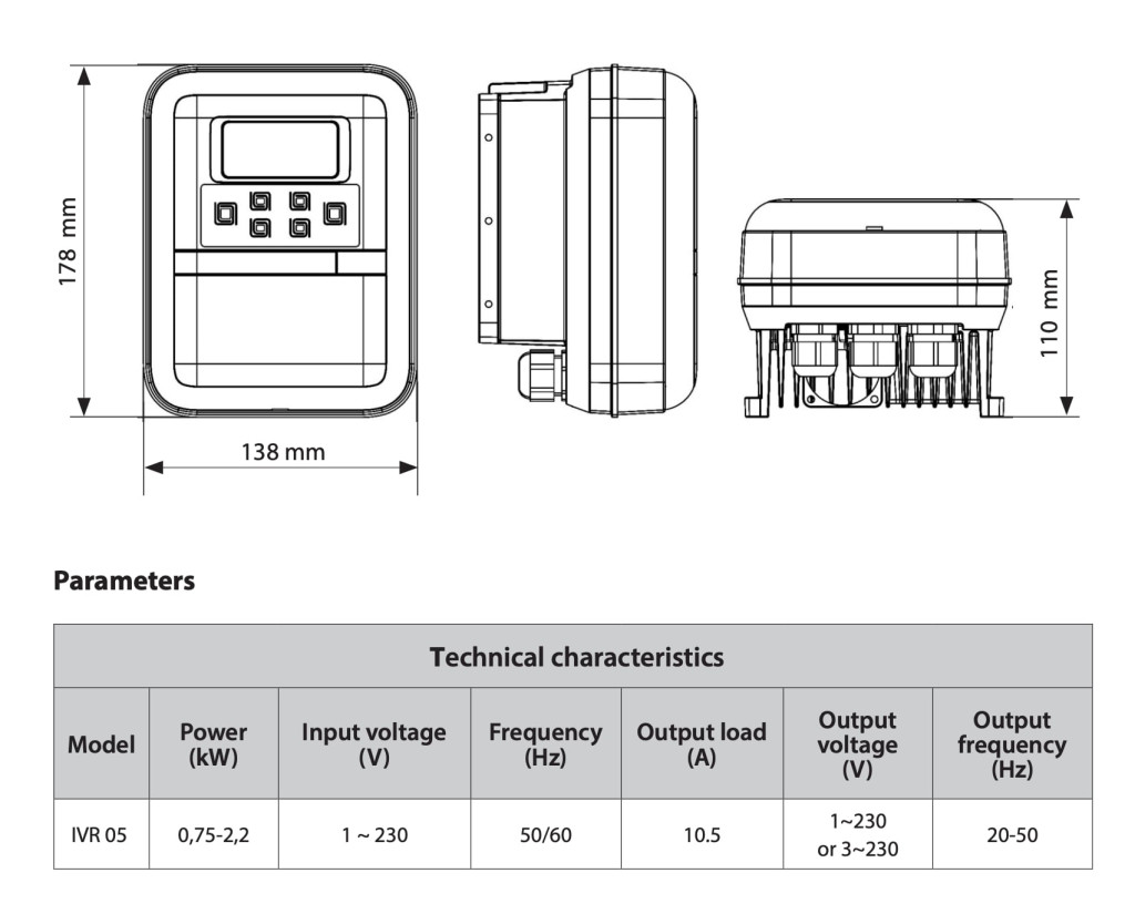 Az IBO IVR-05 (0,75-2,2kW / 10,5A / 3x230 / 3x 400V) inverter 0,37–2,2 kW teljesítményű, 3 fázisú (400 V) szivattyúkhoz készült, és képes két szivattyú vezérlésére is. Az eszköz fejlett V/F (változó frekvencia, változó fordulatszám) vezérlési módszert alkalmaz, és valós idejű nyomásanalízis alapján optimalizálja a szivattyú működését. A nyomás 0,5–9 bar között állítható, a beépített Soft-Start funkció pedig kiküszöböli a hirtelen nyomásingadozásokat. A készülék védelmet nyújt túlfeszültség, túlmelegedés, szárazonfutás, zárlat és rotorblokkolás ellen – külön szondák használata nélkül. A beépített nyomásérzékelő (24 V, 4–20 mA) pontos adatokat szolgáltat, míg az automatikus és kézi üzemmód közötti váltás rugalmasságot biztosít. A készülék 0–40 °C környezeti hőmérsékleten működik, és akár 100 °C hőmérsékletű, tiszta víz szállítására is alkalmas.