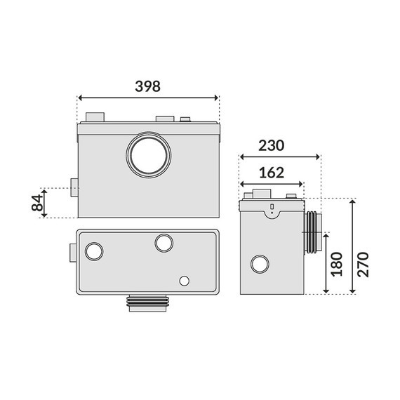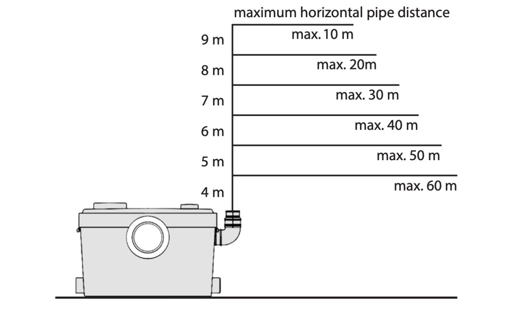 A SANIBO 4 három bemeneti csatlakozással rendelkezik: egy 100 mm-es fő bemenet WC csatlakoztatásához, valamint két 40 mm-es bemenet mosdókagyló vagy zuhany csatlakoztatására. A szivattyú kimeneti átmérője 40 mm. A beépített automata kapcsolórendszer a készülék feltöltése után azonnal indítja a szivattyút, de igény esetén manuálisan is működtethető. A berendezés akár 90°C hőmérsékletű folyadék szivattyúzására is alkalmas, ami kiemelkedő rugalmasságot biztosít a használat során.