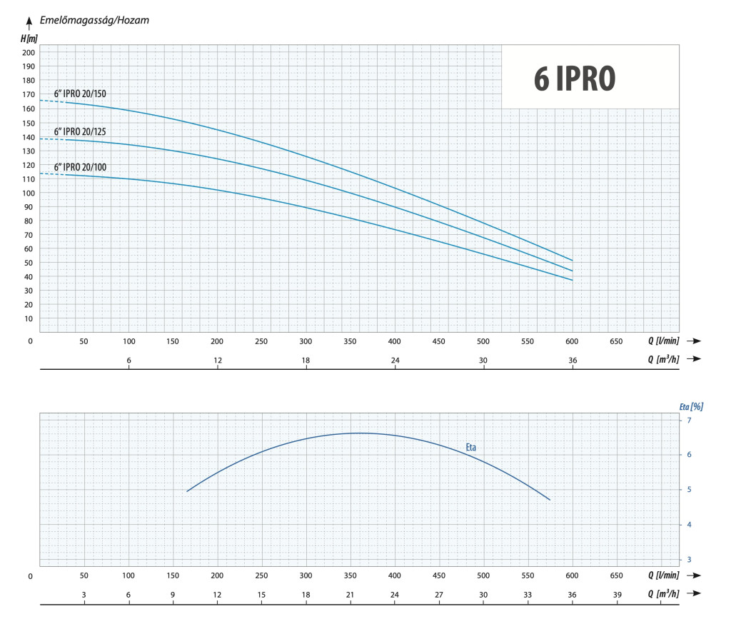 A 6" IPRO 20/100 búvárszivattyú 160 mm belső átmérőjű kutakba telepíthető. A készülék 400 V~/50 Hz hálózati feszültségről működik, kábeltotldást követően igen egyszerű a telepítése. Kiemelkedő homoktűrő képességét a lebegő járókerekes rendszer és a rendkívül kopásálló anyagok – rozsdamentes acél és erősített műanyag – garantálják. A motorba beépített hővédelem és kondenzátor további biztonságot és megbízható működést biztosít. A szivattyú folyamatos üzemben is használható, akár 150 méter merülési mélységig. IP68-as védettségének köszönhetően teljesen vízálló, és a NEMA szabványnak megfelelő tengelykapcsolattal rendelkezik. Maximális folyadék- és környezeti hőmérséklet: 35 °C, maximális fordulatszám: 2850 RPM.