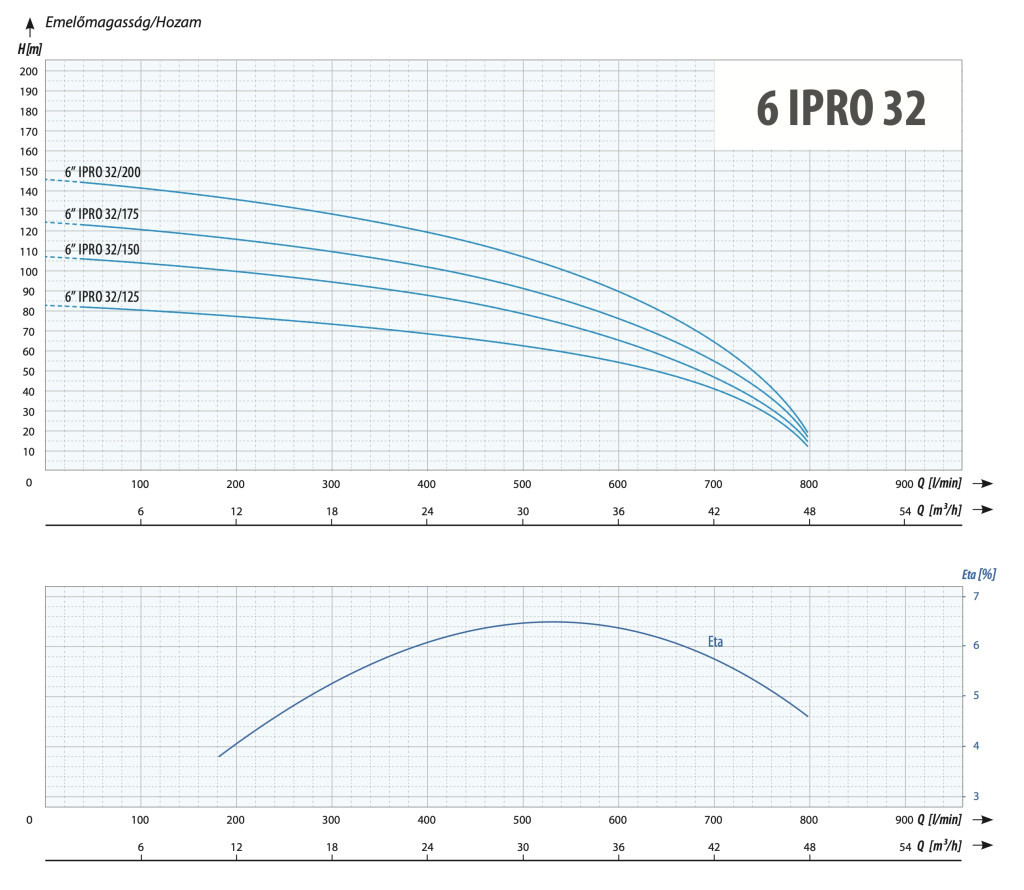 A 6" IPRO 32/175 búvárszivattyú 160 mm belső átmérőjű kutakba telepíthető. A készülék 400 V~/50 Hz hálózati feszültségről működik, kábeltotldást követően igen egyszerű a telepítése. Kiemelkedő homoktűrő képességét a lebegő járókerekes rendszer és a rendkívül kopásálló anyagok – rozsdamentes acél és erősített műanyag – garantálják. A motorba beépített hővédelem és kondenzátor további biztonságot és megbízható működést biztosít. A szivattyú folyamatos üzemben is használható, akár 150 méter merülési mélységig. IP68-as védettségének köszönhetően teljesen vízálló, és a NEMA szabványnak megfelelő tengelykapcsolattal rendelkezik. Maximális folyadék- és környezeti hőmérséklet: 35 °C, maximális fordulatszám: 2850 RPM.