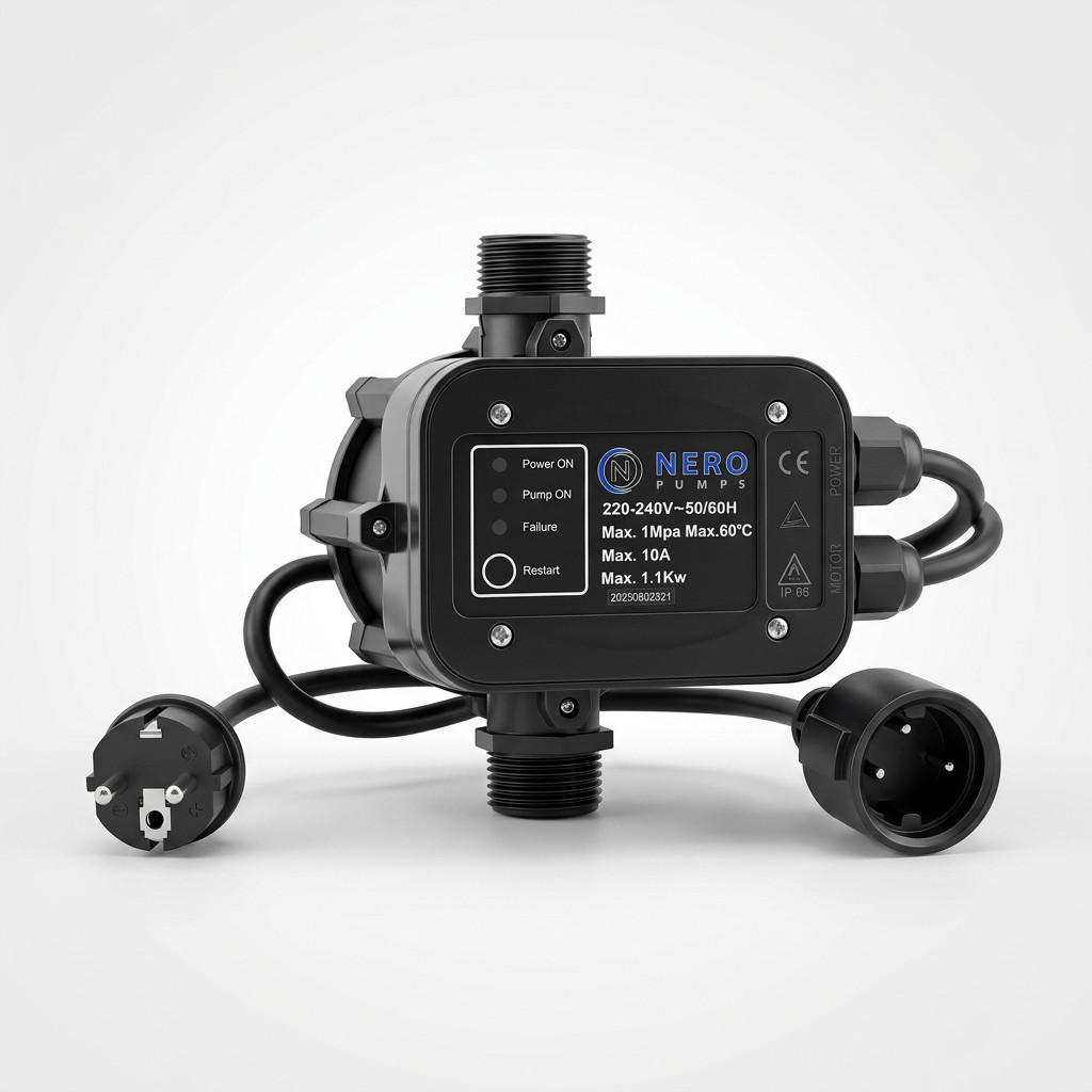 A NERO SC-10A áramlásvezérlő áramláskapcsoló automatika biztosítja a szivattyú automatikus indítását és leállítását a vízfogyasztás függvényében. A beépített szárazonfutás védelem megakadályozza a szivattyú károsodását vízhiány esetén. Kompakt kialakítása és egyszerű telepíthetősége révén gyorsan üzembe helyezhető bármilyen szivattyúrendszerrel.