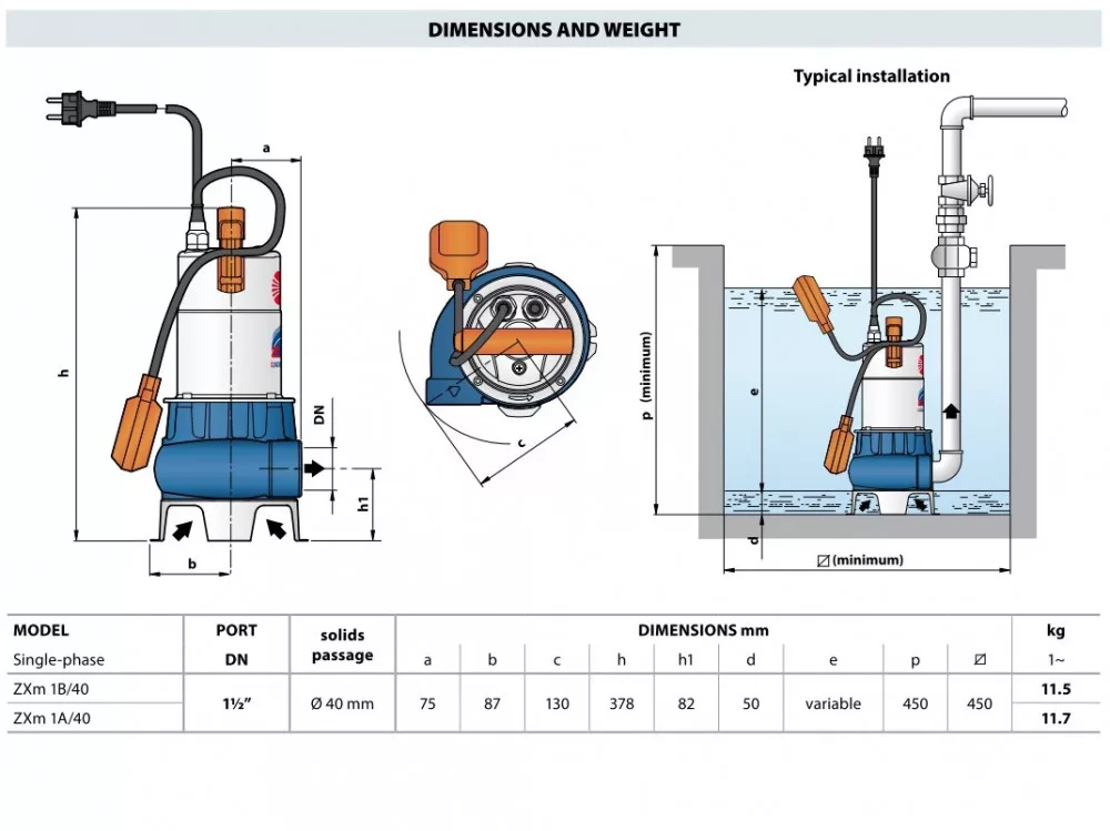 A Pedrollo ZXm 1B/40 - 5m szennyvíz szivattyú egy merülőmotoros, elektromos meghajtású, Vortex járókerekes igen szennyezett, fekáliás víz szállítására is alkalmas szivattyú.Teljesítménye 400 liter/percig (24 m3/h-ig), emelőmagassága pedig 11 méterig terjedhet.Folyadékhőmérséklet tűrése max. 40 °C. Ürítési szintje a fenéktől számítva 50 mm. A készülék folyamatos (S1) működésű.A szivattyú háza, csavarmentes csőcsatlakozással ellátott nyomóoldali burkolata öntvényből, Vortex rendszerű, örvénykeltő járókereke üvegszállal megerősített technopolimerből, motortengelye pedig rozsdamentes acélból készült.Motorja egy robusztus szerkezet, mely igen csendes üzemű és bírja a tartós üzemelést. Beépített kondenzátorral és hővédelemmel rendelkezik. Jelenleg csak egyfázisú verzióban elérhető.A készülék úszókapcsolóval ellátott, mely óv a szárazonfutástól és irányítja a ki- és bekapcsolást. Ez azt jelenti, hogy felügyelet nélkül automatikusan tud üzemelni a szivattyú.Típus függvényében 5 vagy 10 méteres elektromos kábel jár a berendezéshez.