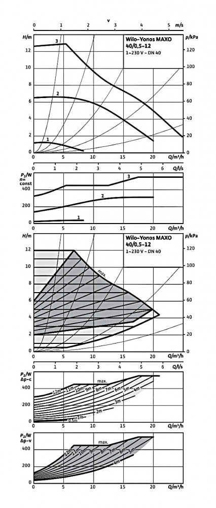 A WILO Yonos MAXO 40/0,5-12 PN6/10 nedvestengelyű fűtési szivattyú hűtési és fűtési rendszerekbe egyaránt alkalmazható. Csőcsatlakzása: karimásA szivattyú előre felprogramozott működési módokkal rendelkezik melyek közül az üzemeltetés módjának és a hűtési vagy fűtési rendszer függvényében kell kiválasztani a megfelelőt. Ez a fűtési szivattyún (a motorfedélen) egy LED kijelző került elhelyezésre, melynek segítségével a készülék beállítható, illetve ezen keresztül kapjuk meg a különéle üzemi és hibajelzéseket is. Emellett a motorfedélen egy üzemi állpotjelző fény is található, ez szintén a különféle állapotok kijelzésére és zavarjelzésre szolgál.A WILO Yonos MAXO 40/0,5-12 PN6/10 szivattyú maniálisan és automatikusan egyaránt üzemeltethető.Kézi üzemeltetés esetén választhatjuk például az előd WILO TOP-S típushoz hasonlóan fordulatszám fokozatok közül. De lehetőségünk nyílik az emelőmagasság kézi beállítáásra is, ha éppen erre van szükségünk.Automatikus üzemeltetés esetén a szivattyú képes a teljesen automatikusan történő fokozatmentes fordulatszám választásra.Mivel a készülék fordulatszáma eleve váltoutatható ezért képes a lágyindításra. A szivattyúban beépített motorvédelem található melynek segítségével a közvetlenül vezérelt motor túlmelegedése elkerülhető. Emellett az ún blokkolás mentesítő funkciónak köszönhetően elkerülhető a szivattyú megszorulása így elkerülthetők a kellemetlen meglepetések.