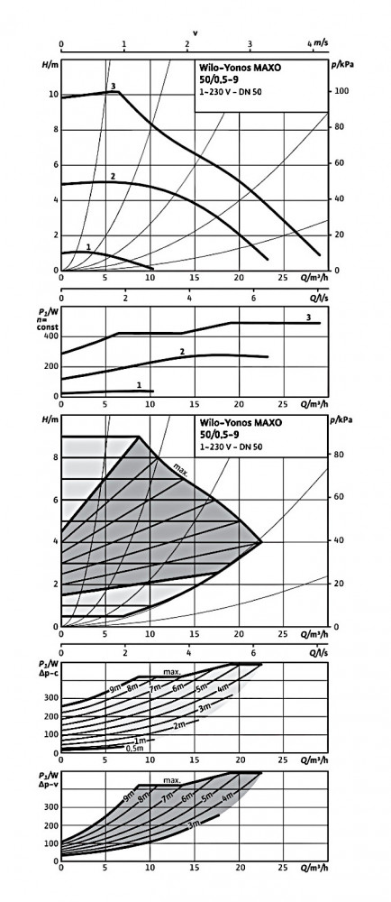 A WILO Yonos MAXO 50/0,5-9 PN6/10 nedvestengelyű fűtési szivattyú hűtési és fűtési rendszerekbe egyaránt alkalmazható. Csőcsatlakzása: karimásA szivattyú előre felprogramozott működési módokkal rendelkezik melyek közül az üzemeltetés módjának és a hűtési vagy fűtési rendszer függvényében kell kiválasztani a megfelelőt. Ez a fűtési szivattyún (a motorfedélen) egy LED kijelző került elhelyezésre, melynek segítségével a készülék beállítható, illetve ezen keresztül kapjuk meg a különéle üzemi és hibajelzéseket is. Emellett a motorfedélen egy üzemi állpotjelző fény is található, ez szintén a különféle állapotok kijelzésére és zavarjelzésre szolgál.A WILO Yonos MAXO 50/0,5-9 PN6/10 szivattyú maniálisan és automatikusan egyaránt üzemeltethető.Kézi üzemeltetés esetén választhatjuk például az előd WILO TOP-S típushoz hasonlóan fordulatszám fokozatok közül. De lehetőségünk nyílik az emelőmagasság kézi beállítáásra is, ha éppen erre van szükségünk.Automatikus üzemeltetés esetén a szivattyú képes a teljesen automatikusan történő fokozatmentes fordulatszám választásra.Mivel a készülék fordulatszáma eleve váltoutatható ezért képes a lágyindításra. A szivattyúban beépített motorvédelem található melynek segítségével a közvetlenül vezérelt motor túlmelegedése elkerülhető. Emellett az ún blokkolás mentesítő funkciónak köszönhetően elkerülhető a szivattyú megszorulása így elkerülthetők a kellemetlen meglepetések.